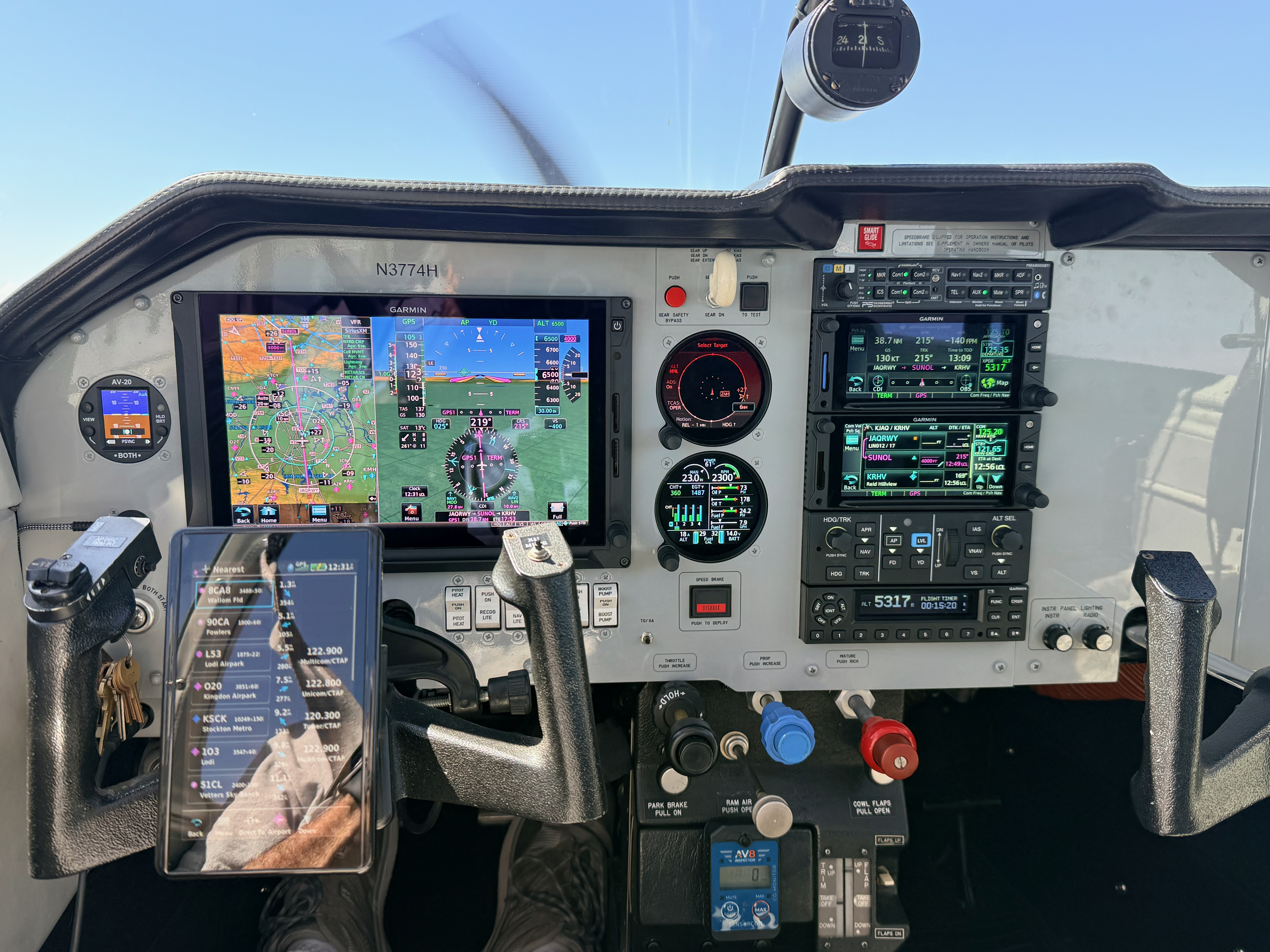 a full glass Garmin panel by Pacific Coast Avionics in Aurora, OR, the Lo Presti Super 201 cowling (designed on this aircraft), and recently an MT propellor.